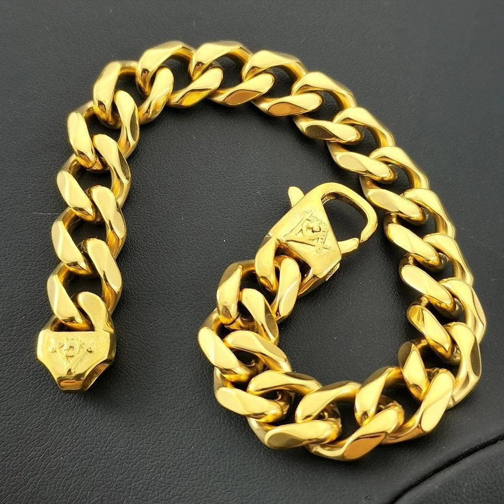 Freemasonry Masonic Mason Bracelet Mens Stainless Steel Yellow 11mm Width