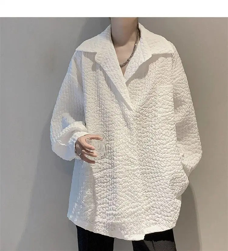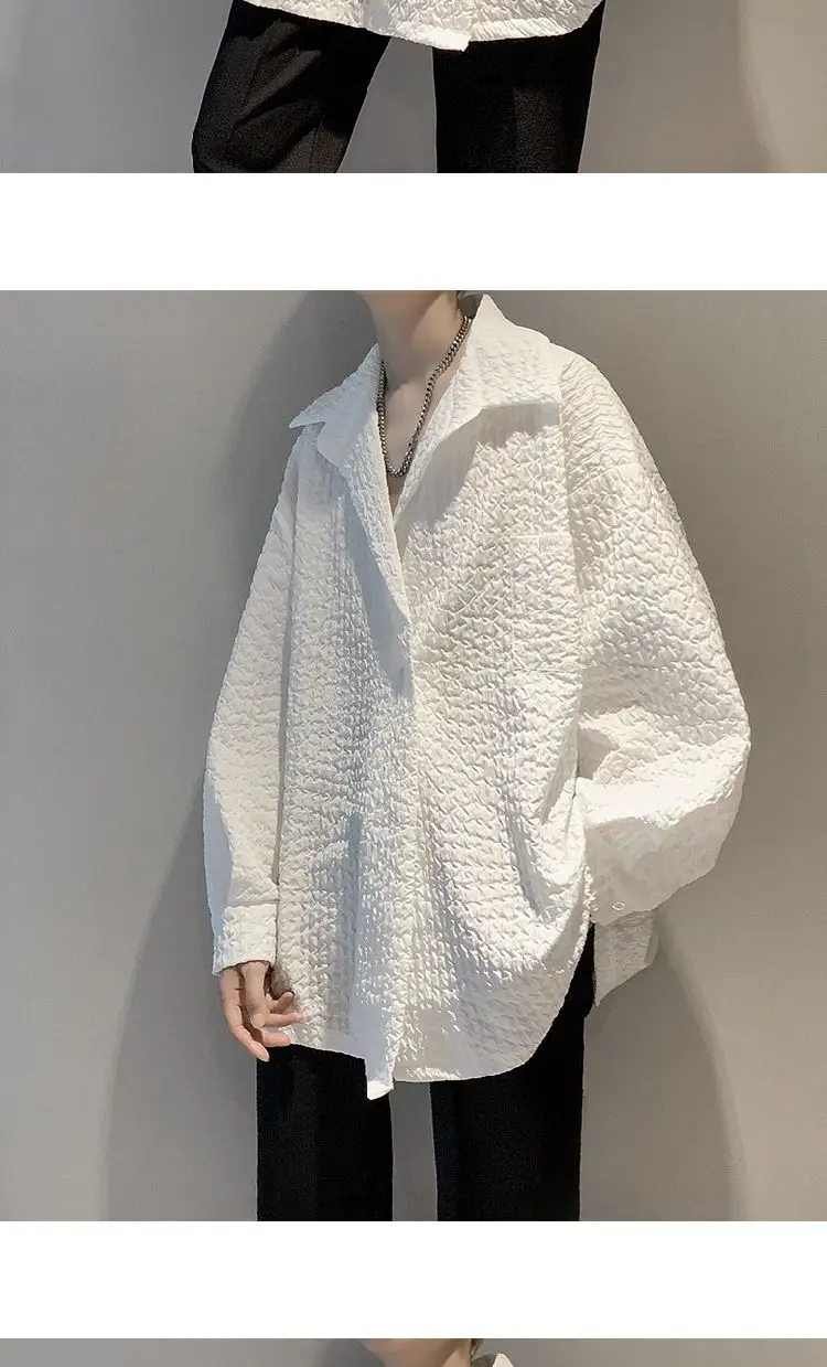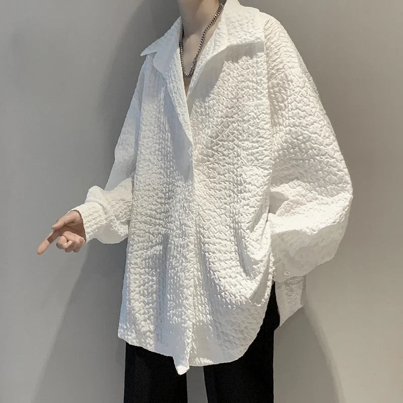 Men's White Textured Oversized Long Sleeve Shirt Loose Casual Wrinkle Fabric Button Down Blouse Fashion Streetwear Tops